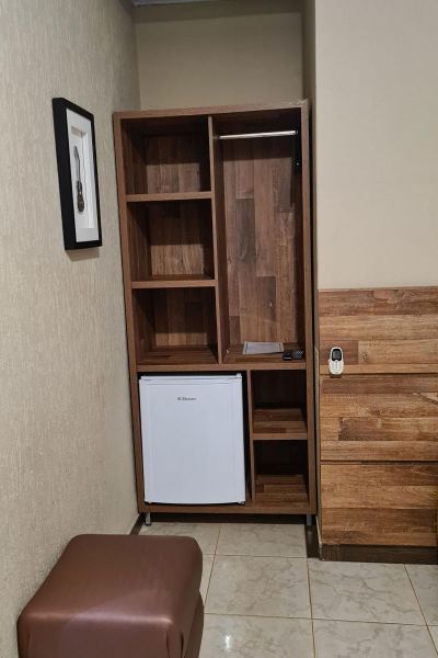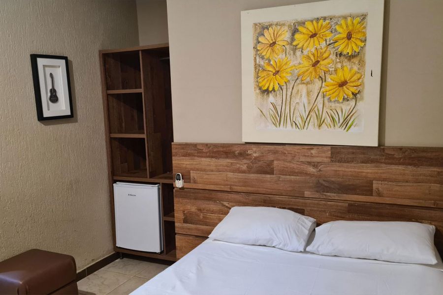 Acomodação tripla, com uma (1) cama de casal e uma (1) solteiro. Possui ar-condicionado e frigobar. A TV não é grande, a propósito, para você curtir a fazenda e não perder tempo.