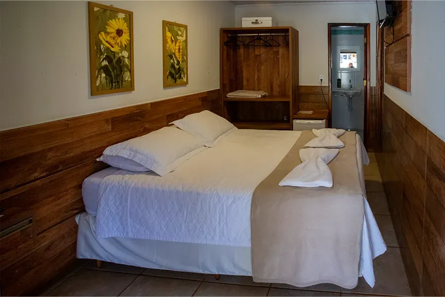 O quarto não é tão grande, mas é para casal.