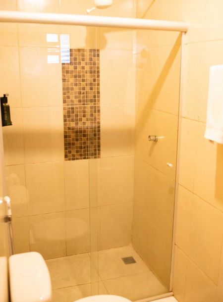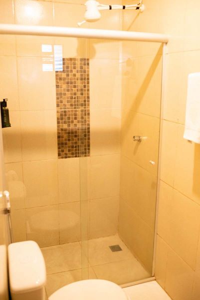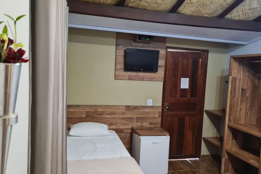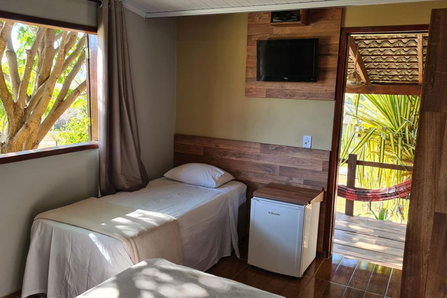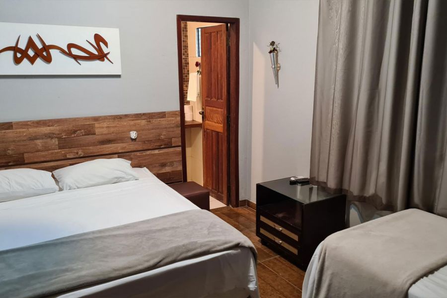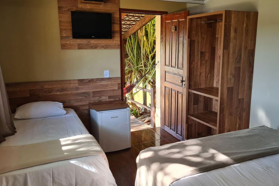 Suíte muito confortável, com uma (1) cama de casal e uma (1) de solteiro. Possui ar-condicionado. A TV não é grande…mas é um quarto ideal para aqueles que gostam de privacidade.