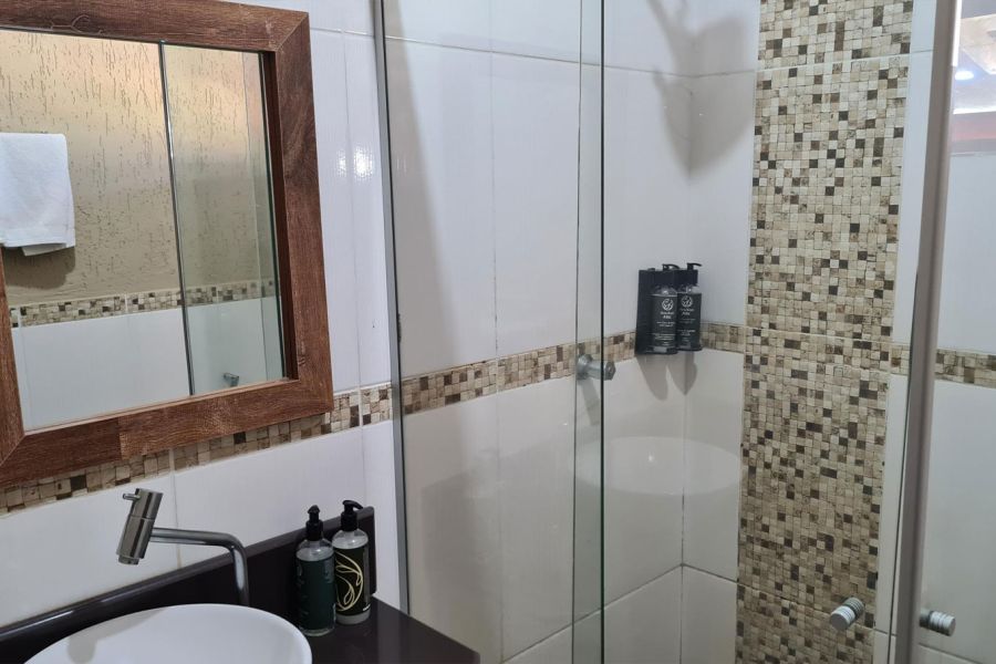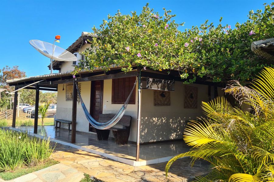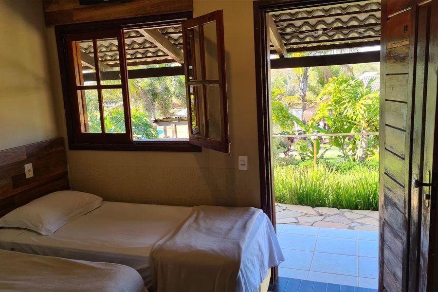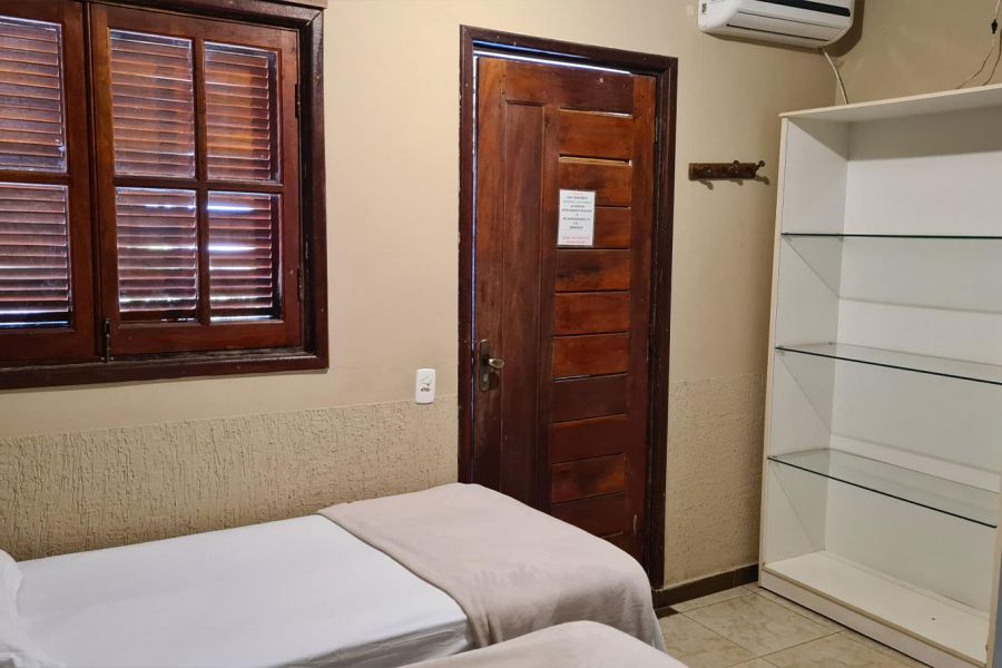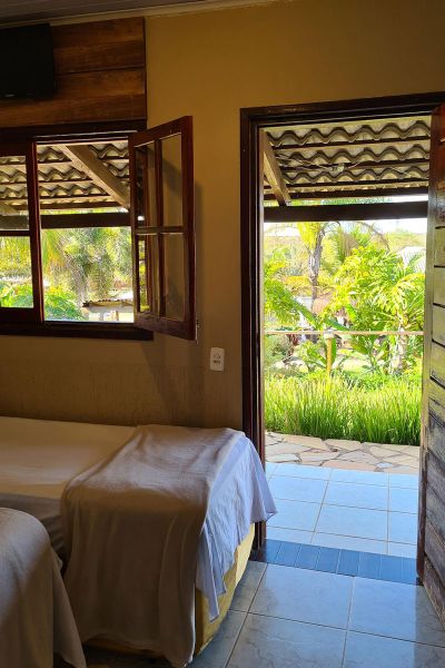 Acomodação tripla, com uma (1) cama de casal e uma (1) solteiro. Possui ar-condicionado e frigobar. A TV não é grande, a propósito, para você curtir a fazenda e não perder tempo.