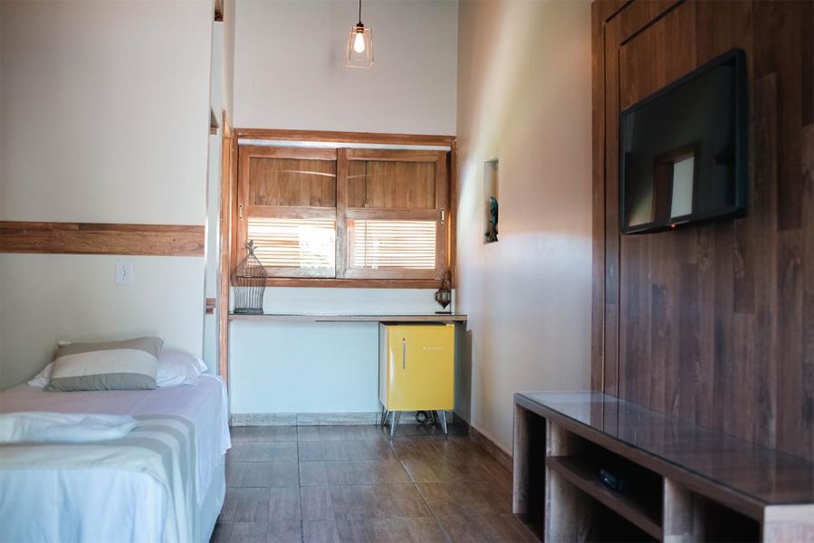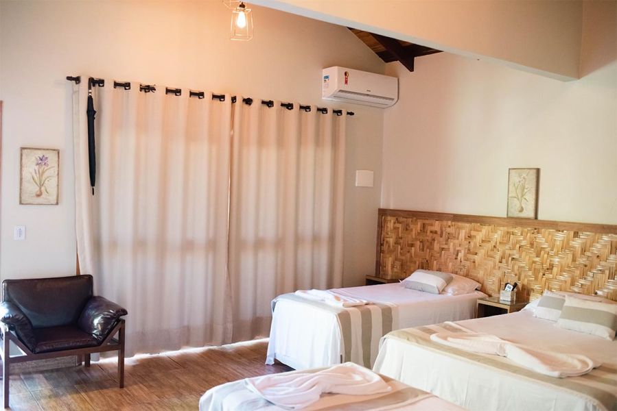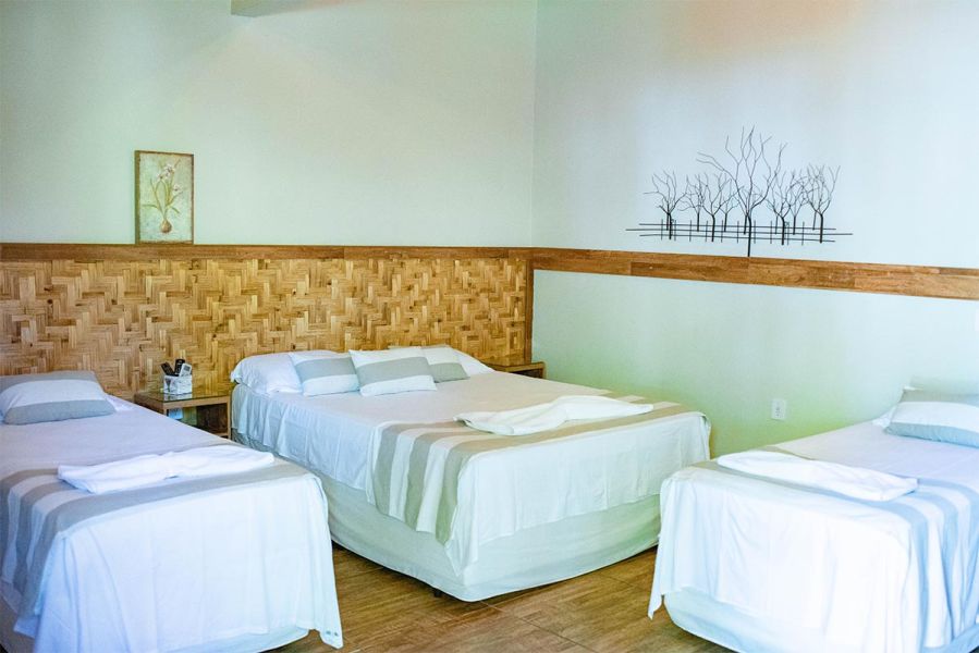 Enorme, bem decorada, banheiro com duas (2) duchas, uma (1) cama queen e duas (2) camas de solteiro. Possui aquela poltrona confortável, frigobar retro, ar-condicionado, TV de 40 polegadas com sky.