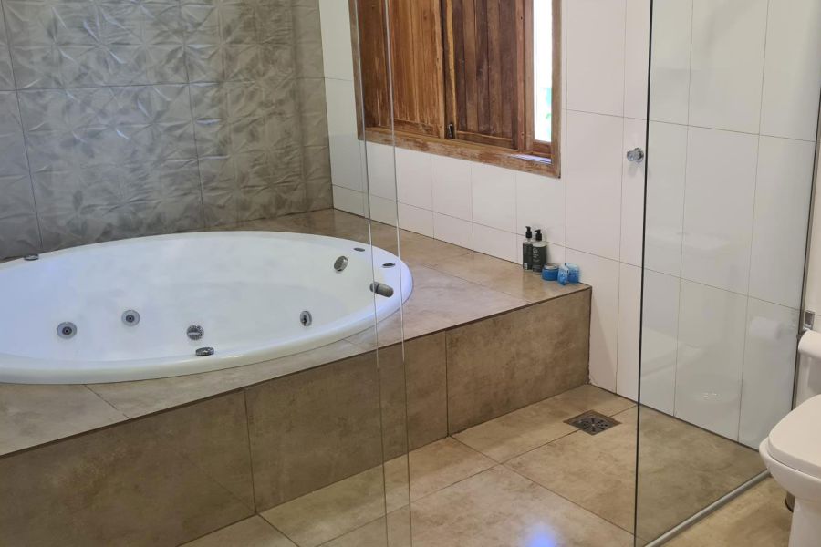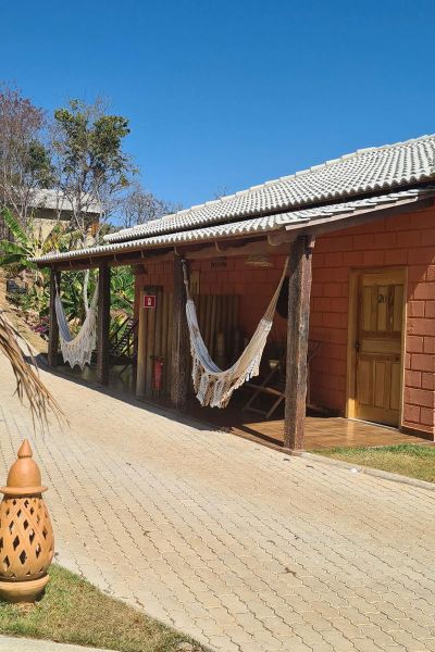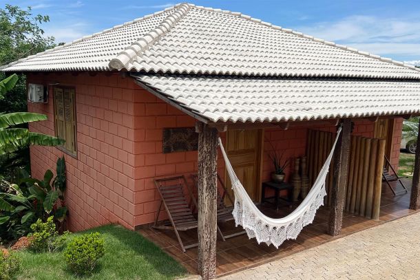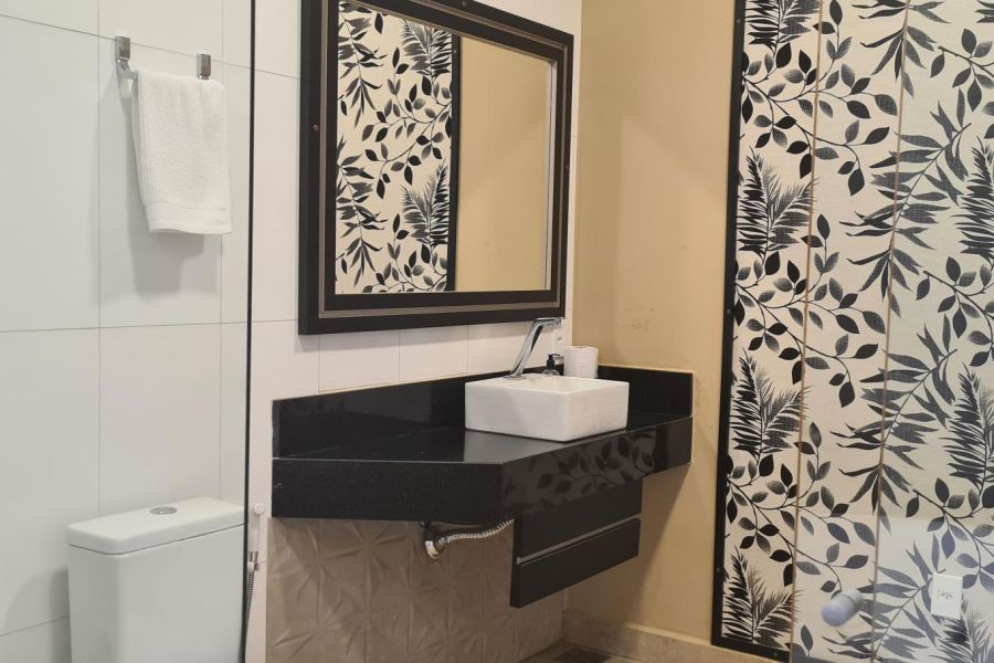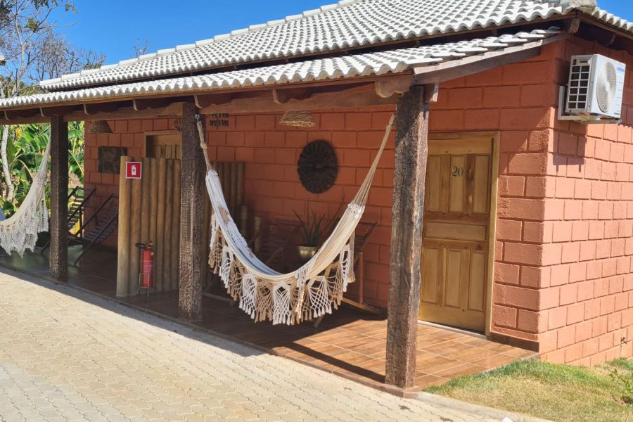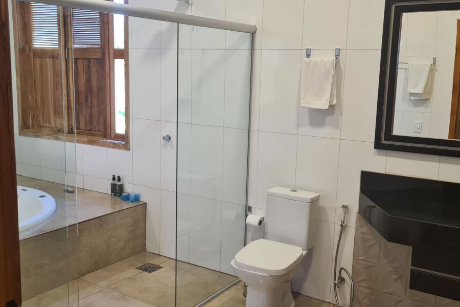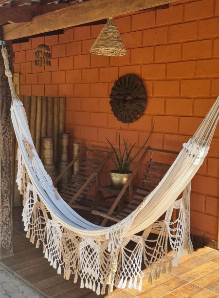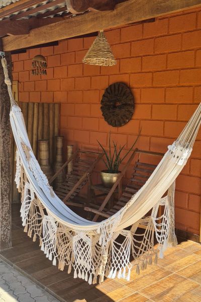 Além de todo requinte, a suíte possui banheiro amplo com uma hidromassagem, bem como uma estilosa varanda com rede e cadeiras.