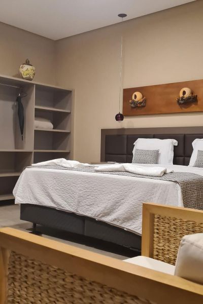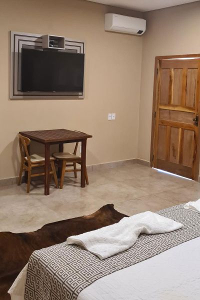 Possui cama king, TV de 50 polegadas, frigobar, mesa com duas cadeiras e uma poltrona com alto estilo e charme.